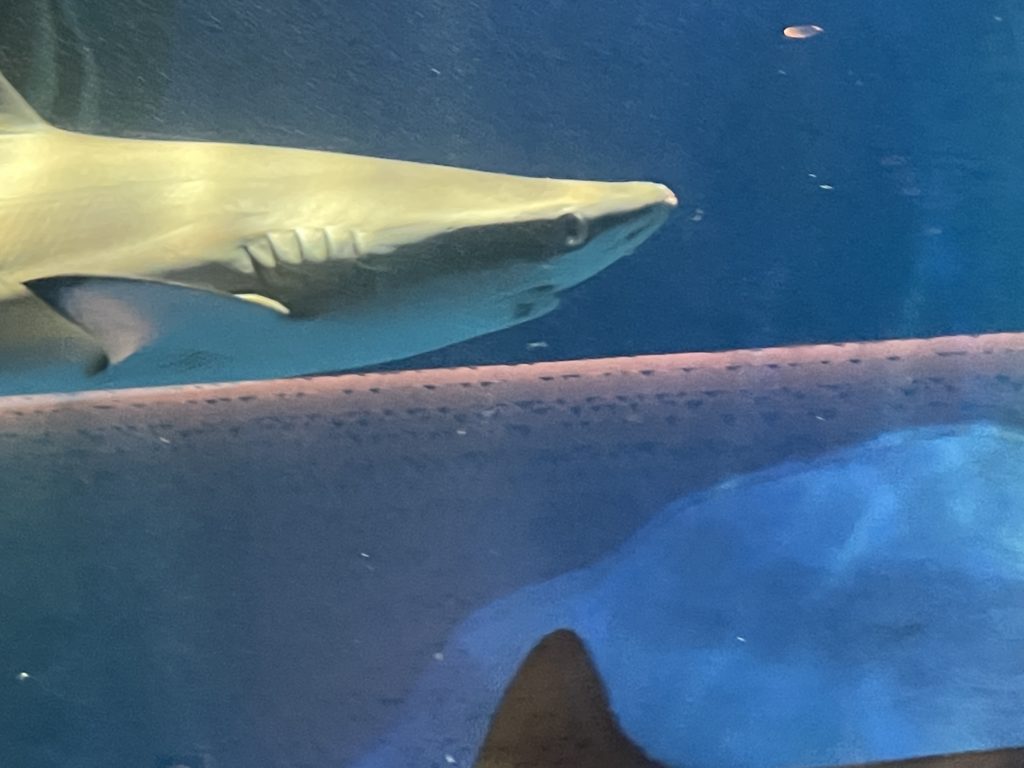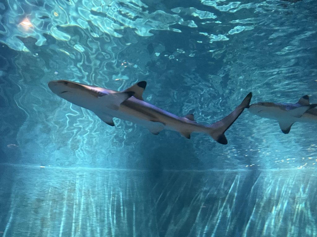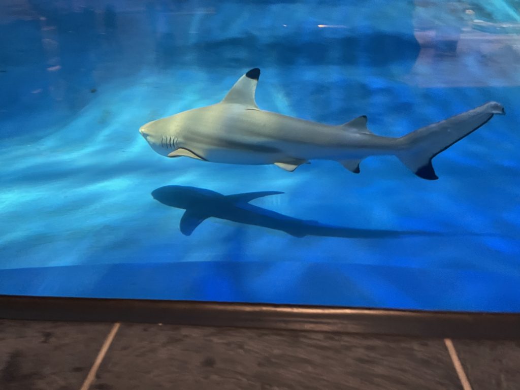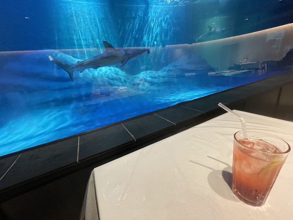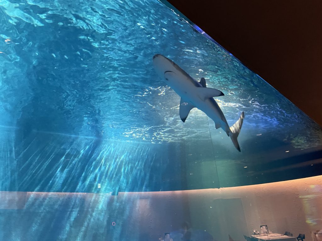 店内に大きな水槽が設置され、中では10匹以上のサメが悠々と泳いでいました。水族館でご飯を食べているみたい。