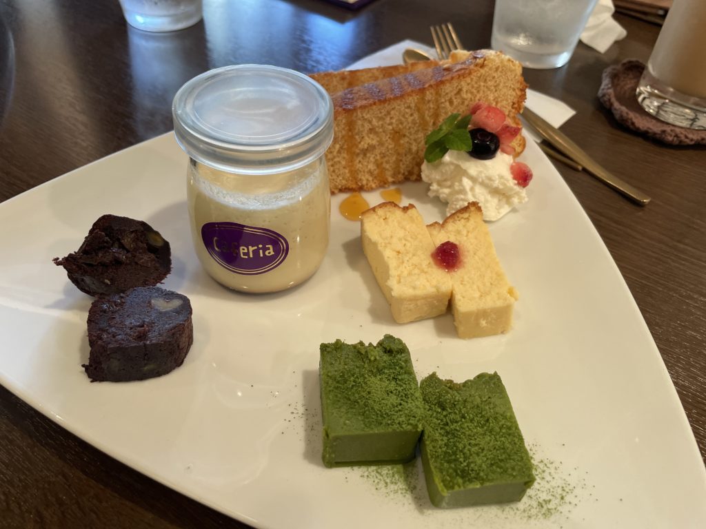 右上から時計回りに、紅茶シフォン、チーズケーキ、抹茶、ガトーショコラ、プリン。