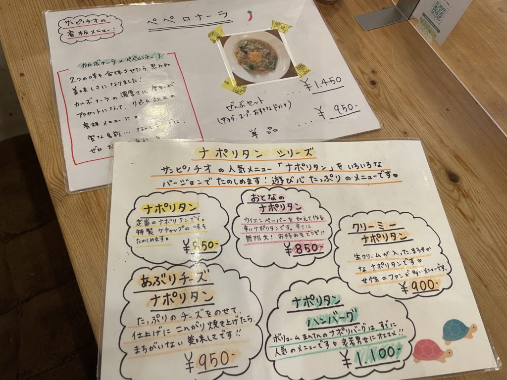 メニューはこんな感じ。オムライスが名物かと思ったけど、スパゲティがいいのかな?ペペロナーラが気になった。