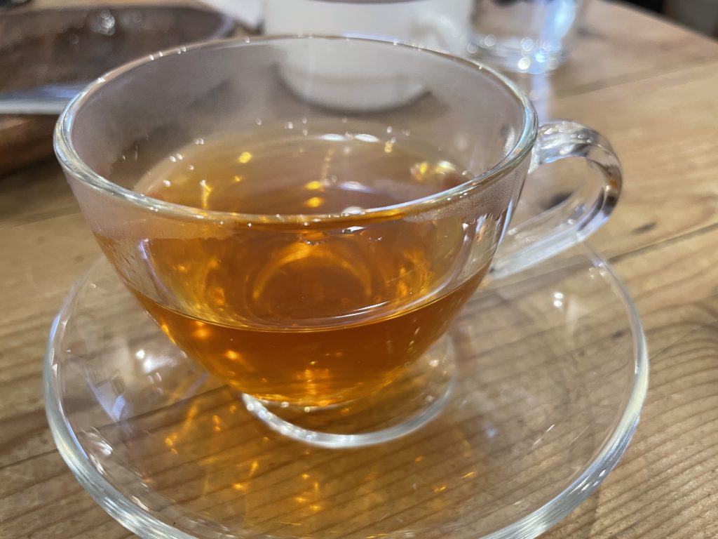 妻が食後に飲んでいた、ハーブティー。疲労回復、美容促進などをテーマに、いろいろブレンドしたものから選べるようでした。これはアップルチップ入りのルイボス。これがまた美味しかった。食後にピッタリ。