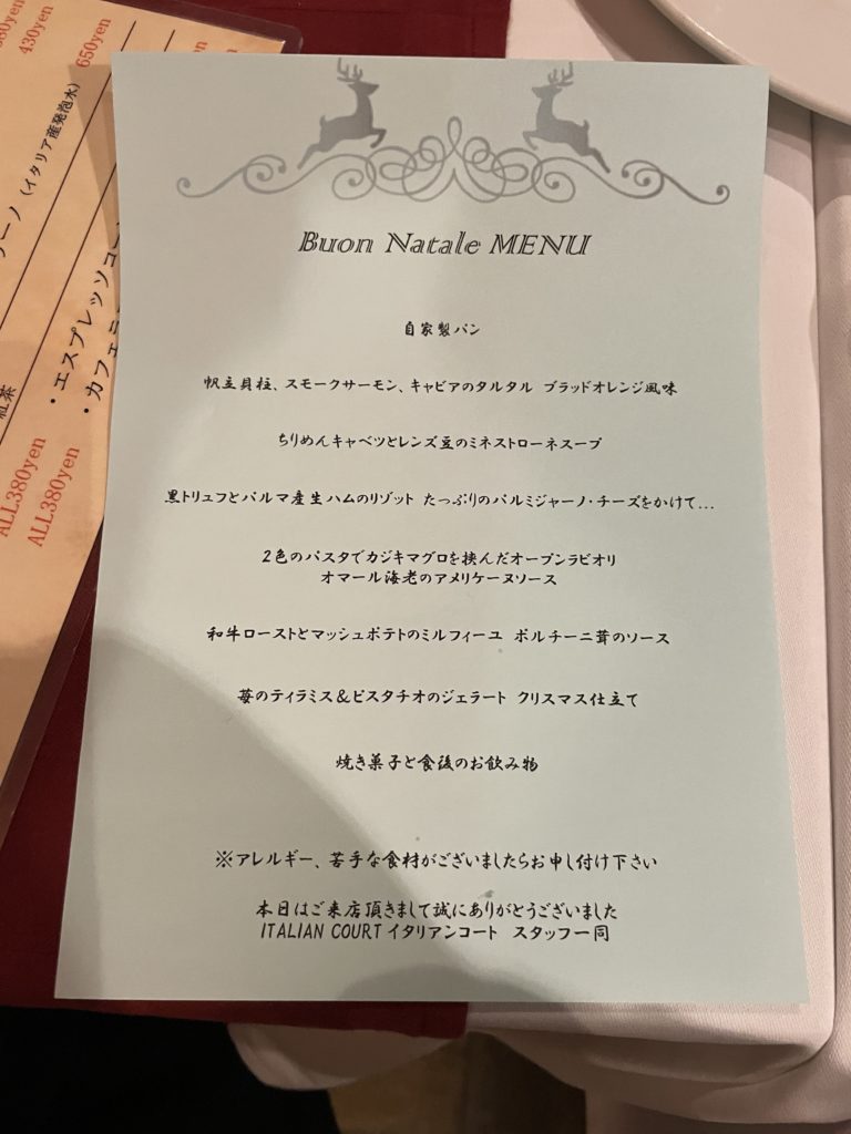 さて今回はクリスマスの限定ディナーコースを食べてきました。